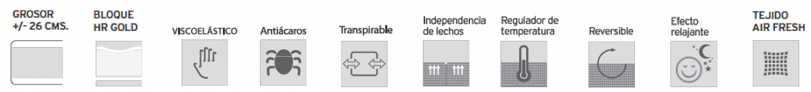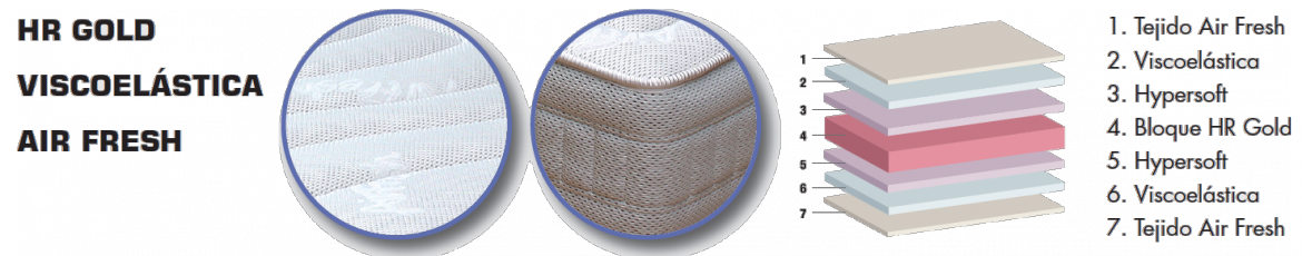 En este colchón viscoelástico, hemos apostado por la máxima calidad en su composición. El tejido exterior Air Fresh incluye los tratamientos más efectivos y beneficiosos para la transpiración en el descanso, su viscoelástico de alta densidad le garantiza una perfecta acogida y el Hypersoft, una correcta sujeción. Además su núcleo central en H.R. GOLD de Alta densidad nos garantiza la firmeza, adaptabilidad y durabilidad esperada en un colchón de estas características.